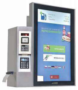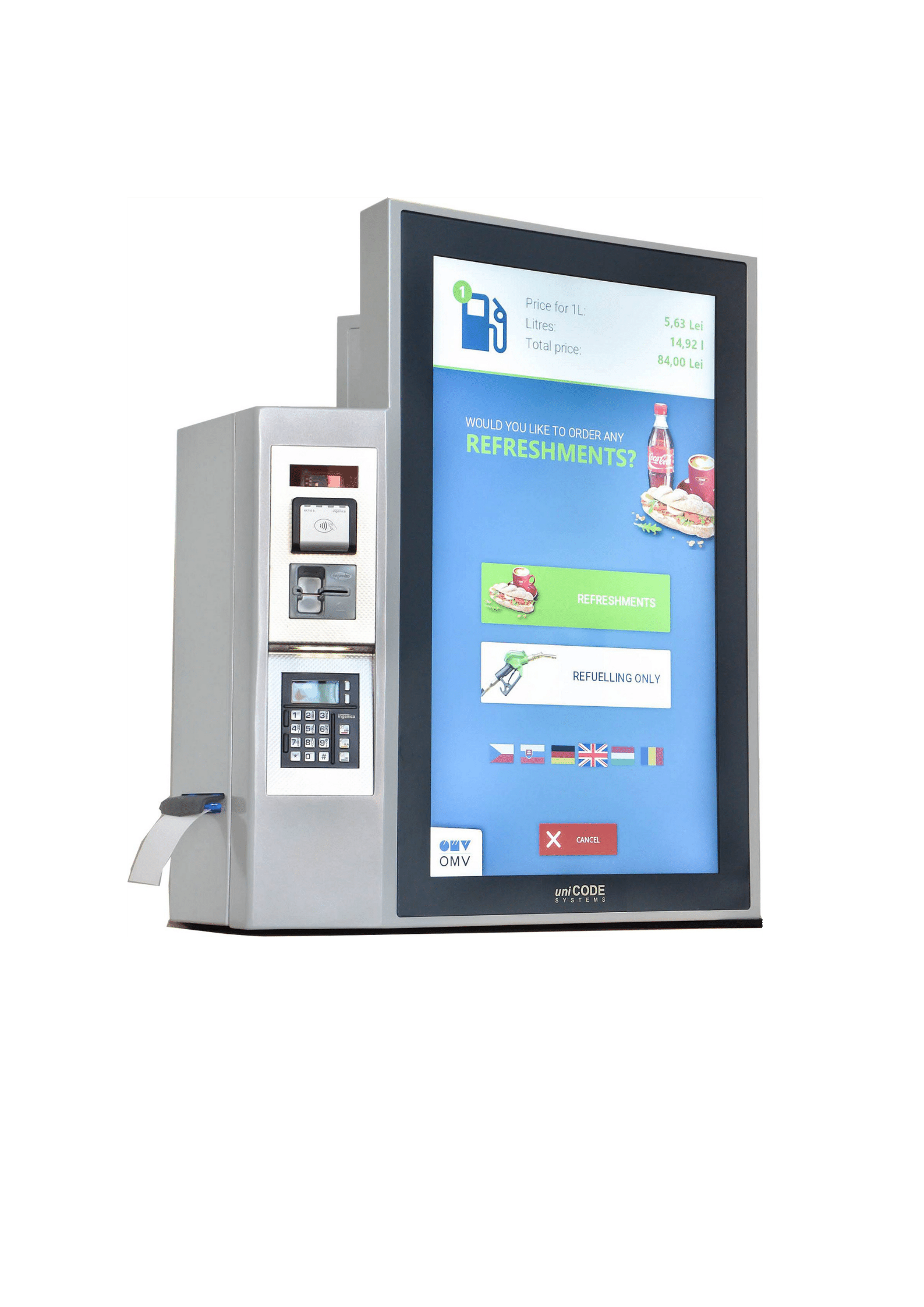 Combines a classic OPT with a large 32“ touchscreen display. It allows for the ordering of refreshments during refuelling. The unique double-sided construction is designed for large petrol stations or EV chargers with food services to mount on an island near the dispensers.