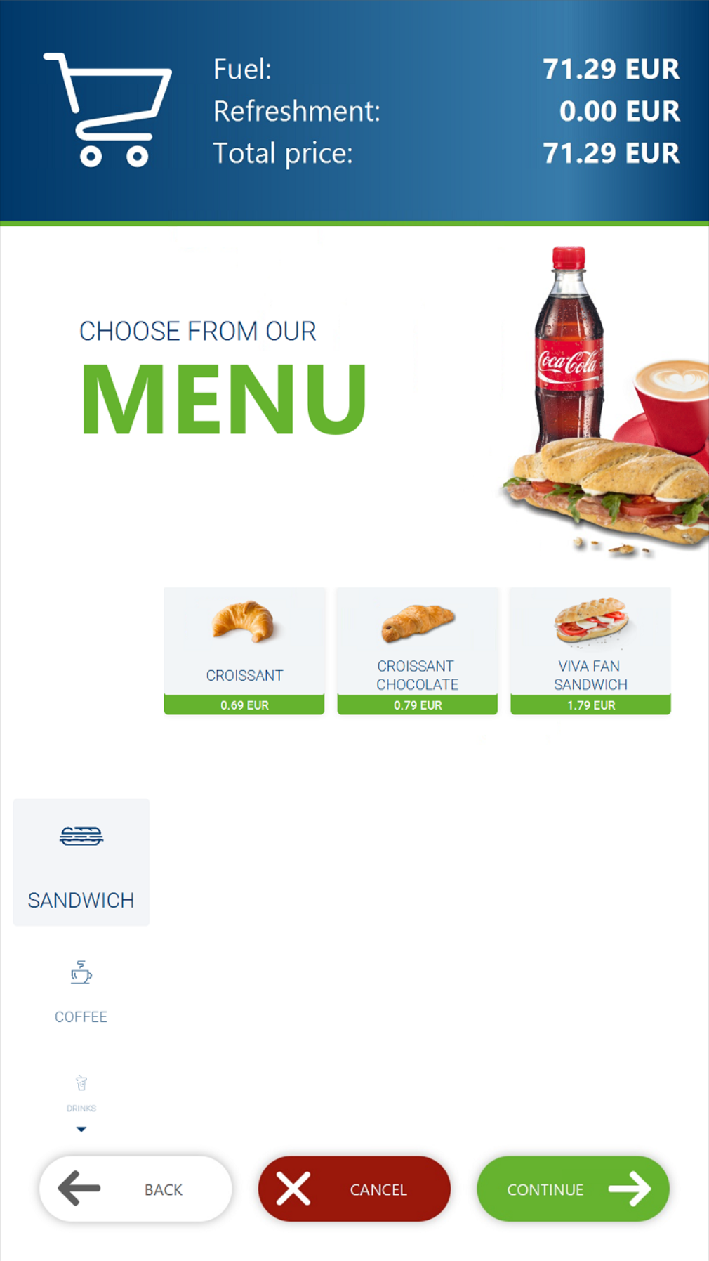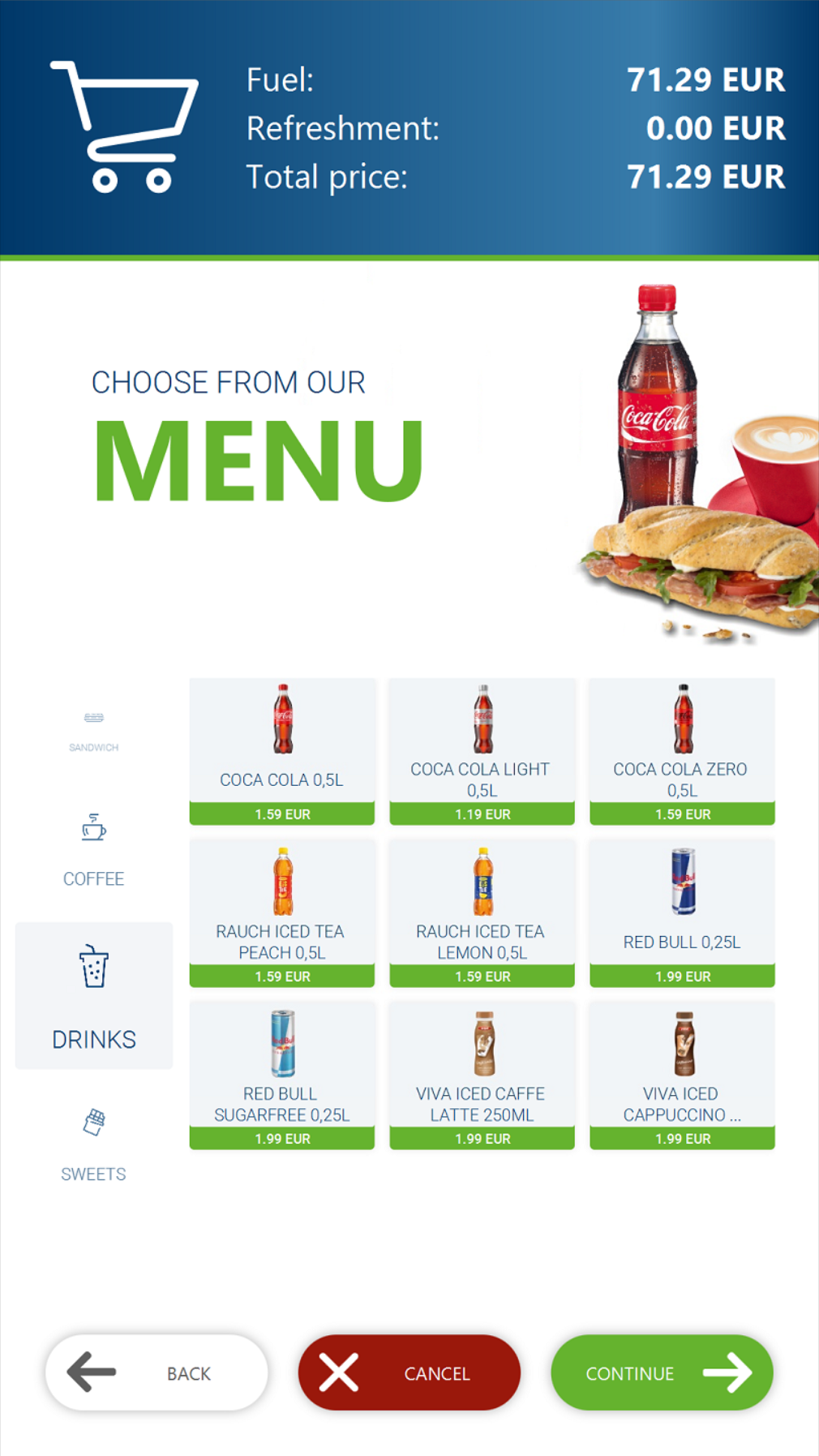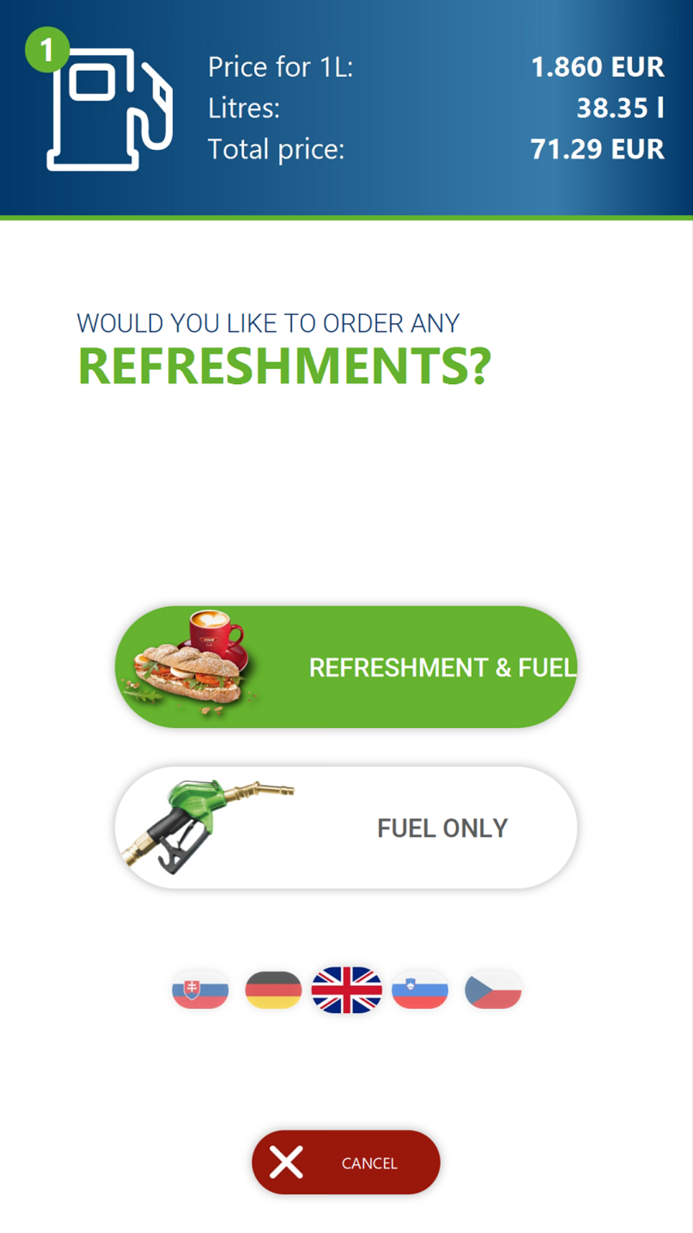 Combines fuel sales and refreshment ordering on one device.